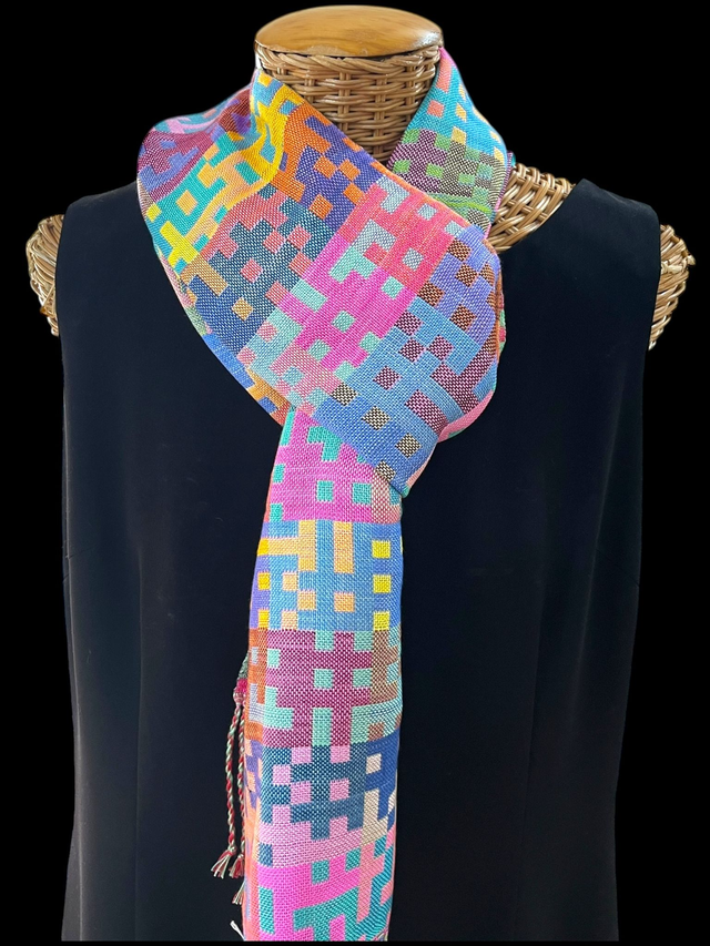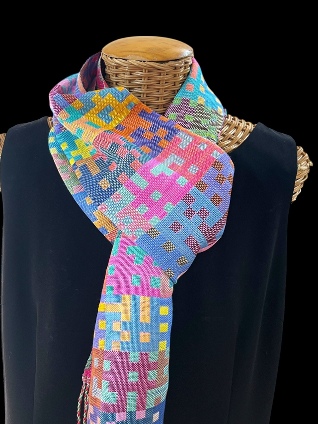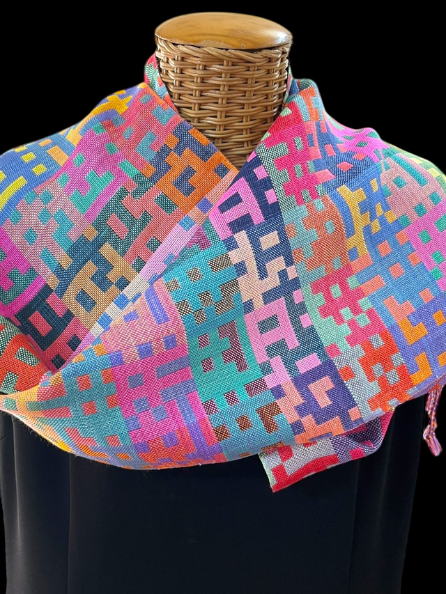 100% silk, this stunning luxury scarf is woven in double weave so there are effectively two sides to the scarf. The jigsaw pattern is my own design and is very striking and unique. There are many colours in this scarf and they interact to give many others! It really can be worn with anything.