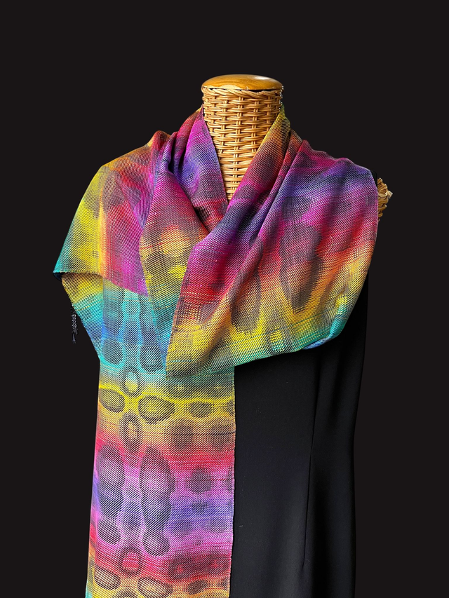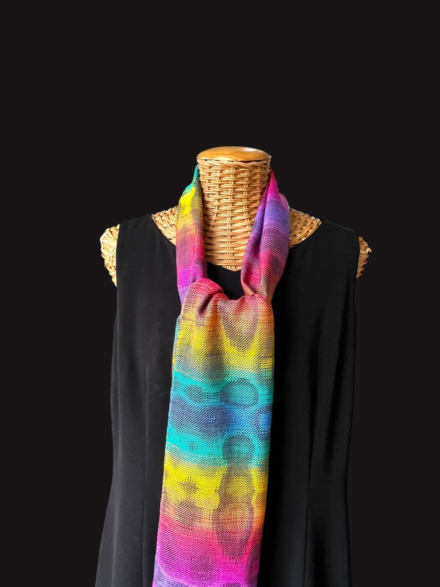 The black warp is illuminated by the rainbow of bright colours along the length of the scarf. I used the Fibonacci sequence to blend the colours so the transitions are very smooth. It was such fun to weave and I think would be enormous fun to brighten up your day.